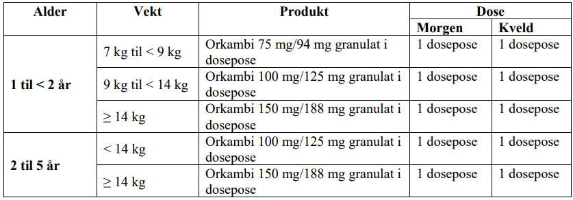 Den anbefalte dosen for pasienter som er 1 år eller eldre er angitt i tabellen nedenfor. Orkambi skal tas om morgenen og om kvelden (med 12 timers mellomrom) sammen med fettholdig mat.