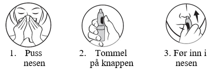 6. Len hodet litt forover. Sprayens spiss føres forsiktig opp i neseboret, og det pumpes én gang under samtidig rolig innpust gjennom nesen.