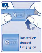 Det er kun dosetelleren og dosepekeren som viser at 1 mg har blitt valgt. Du kan kun velge 1 mg per dose. Når pennen inneholder mindre enn 1 mg, stopper dosetelleren før 1 mg vises. Dosevelgeren klikker forskjellig når den vris forover, bakover eller forbi 1 mg. Ikke tell penneklikkene. |