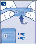 Det er kun dosetelleren og dosepekeren som viser at 1 mg har blitt valgt. Du kan kun velge 1 mg per dose. Når pennen inneholder mindre enn 1 mg, stopper dosetelleren før 1 vises. Dosevelgeren klikker forskjellig når den vris forover, bakover eller forbi 1 mg. Ikke tell penneklikkene. |