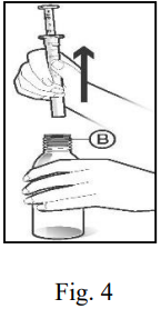 Snu flasken riktig vei og ta deretter doseringspipetten forsiktig ut av flasken. Etter at du har tatt ut doseringspipetten sjekker du nøye at du har tatt riktig mengde av oppløsningen. Adapteren (B) som var festet til doseringspipetten skal nå stå igjen i flasken (Fig. 4).