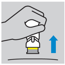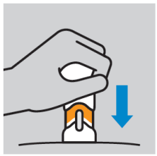 Fjern bunnlokket: Vri og trekk lokket nedover for å fjerne det. Hold hendene unna nålebeskyttelsen når lokket er fjernet. Ikke sett lokket på igjen. Kast bunnlokket umiddelbart. Ikke injiser hvis du mister den ferdigfylte injektoren etter at lokket er fjernet.