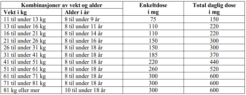 Anbefalt dose er 300 mg tatt som én 150 mg kapsel to ganger daglig.