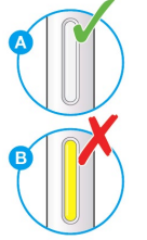 Kontroller at væsken er klar og fargeløs til svakt gul og uten partikler (se bilde A). Bruk ikke pennen hvis dette ikke er tilfelle.