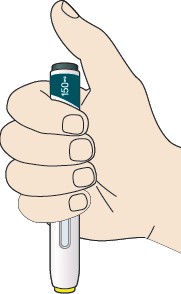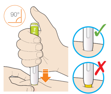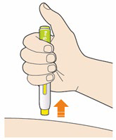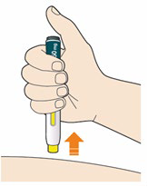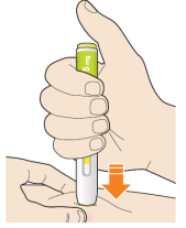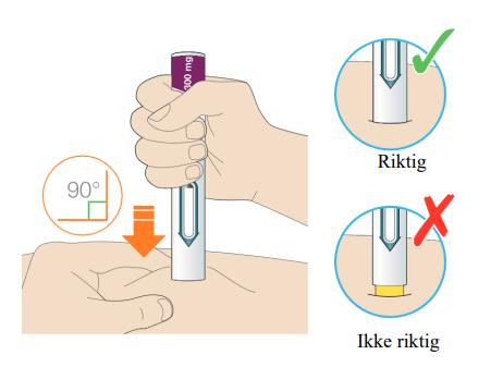 Trykk pennen rett ned mot huden til det gule sikkerhetsdekslet er trykket helt inn i pennen, og hold (se bilde).