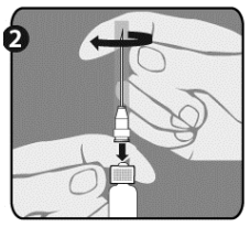 Etter fullført rekonstituering av vaksinen fjerner du lokket fra den andre nålen (som beskrevet i trinn 1 for nålene) og bytter ut nålen som ble brukt til rekonstituering med den andre nålen som skal brukes til administrasjon. Ikke bruk den samme nålen til rekonstituering og administrasjon.