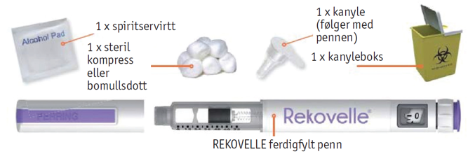 Kanyler leveres sammen med pennen. Kontakt helsepersonell dersom du trenger flere kanyler. Bruk kun kanyler som kommer med REKOVELLE ferdigfylt penn eller som helsepersonell foreskriver.