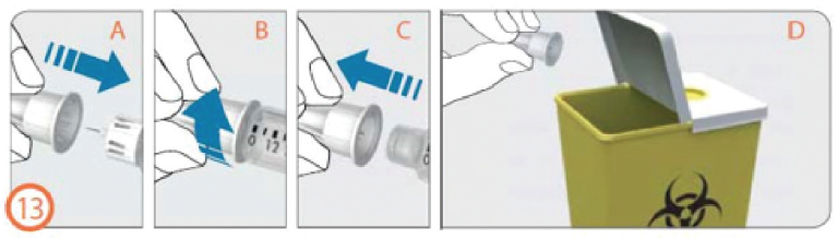 Kast brukte kanyler i en kanyleboks rett etter bruk. Ikke kast kanyleboksen i husholdningsavfallet.