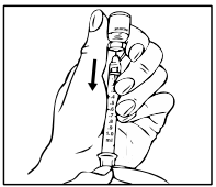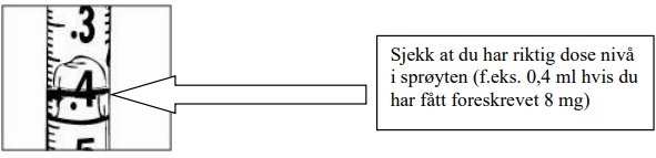 7. Mens nålen fortsatt er i hetteglasset, snus hetteglasset opp-ned. Hold sprøyten i øyenivå, slik at du kan se doseringsmerkene, og sørg for at nålespissen er i væsken hele tiden. Trekk stemplet langsomt ned til 0,4 ml-merket for dosen 8 mg eller 0,6 ml-merket for dosen 12 mg, eller som anvist, avhengig av dosen som er foreskrevet av din lege, sykepleier eller apoteker. Du vil kunne se noe væske eller bobler inni hetteglasset når sprøyten er riktig fylt. Dette er normalt.