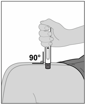 b. Uten at du klemmer eller strekker huden, plasser pennen over injeksjonsstedet i en 90-graders vinkel.