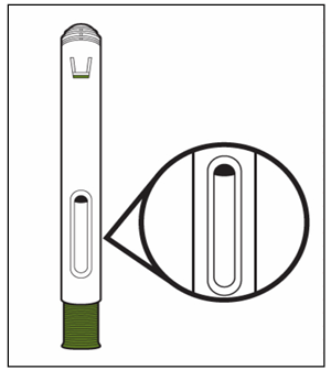 Merk: Hvis den olivengrønne stempelstangen ikke fyller vinduet helt, mottok du ikke hele dosen. Ikke bruk pennen på nytt i dette tilfellet. Ring helsepersonalet umiddelbart.
