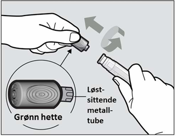 Dersom du ikke får til å fjerne den grønne hetten må du spørre en omsorgsperson om hjelp eller rådføre deg med helsepersonell.