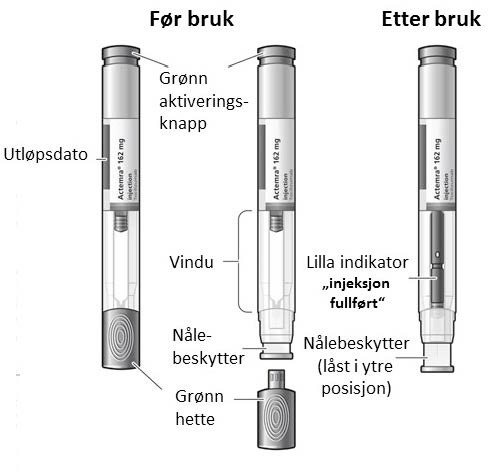 Etter at du har fjernet den grønne hetten er den ferdigfylte pennen klar til bruk. Dersom den ferdigfylte pennen ikke brukes innen 3 minutter etter at hetten er fjernet, må pennen kastes i beholderen for skarpe gjenstander, og en ny ferdigfylt penn må brukes.
