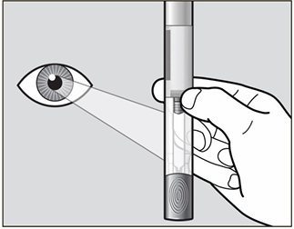Se gjennom det gjennomsiktige vinduet. Kontroller væsken i den ferdigfylte RoActemra-pennen (se figur C). Den skal være klar og fargeløs til gulaktig. Ikke injiser RoActemra hvis væsken er uklar, misfarget eller har klumper eller partikler i seg, fordi det kan hende det ikke er trygt å bruke den. Kast den ferdigfylte pennen på en sikker måte i en beholder for skarpe gjenstander og ta en ny penn.