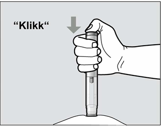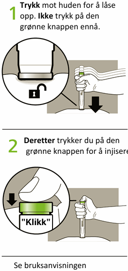 Trykk på den grønne aktiveringsknappen for å starte injeksjonen. En klikkelyd indikerer at injeksjonen starter. Hold inne den grønne knappen og fortsett å holde den ferdigfylte pennen bestemt trykket mot huden (se figur J). Dersom du ikke får til å starte injeksjonen må du spørre om hjelp fra en omsorgsperson eller rådføre deg med helsepersonell.