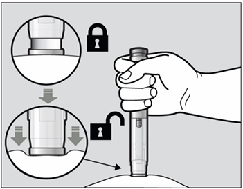 For å bruke den ferdigfylte pennen må du først låse opp den grønne aktiveringsknappen.
