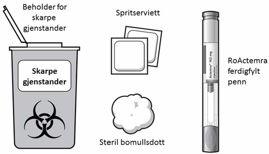 Nødvendig utstyr for en injeksjon med RoActemra ferdigfylt penn (Se figur B):