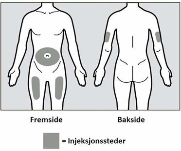 Anbefalte injeksjonssteder er foran på låret eller magen, unntatt et område på 5 cm rundt navlen (se figur D).