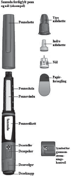 Kontroller navnet og den fargede etiketten på pennen for å forsikre deg om at den inneholder Saxenda. Dette er spesielt viktig hvis du bruker mer enn én type injeksjonslegemiddel. Hvis du bruker feil legemiddel, kan det være skadelig for helsen din.