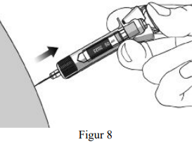 Når stempelet er trykket inn så langt det er mulig, behold trykket på stempelet samtidig som du trekker kanylen ut av huden (se figur 8).