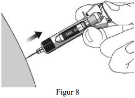 Når stempelet er trykket inn så langt det er mulig, behold trykket på stempelet samtidig som du trekker kanylen ut av huden (se figur 8).