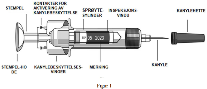 La beskyttelseshetten sitte på den ferdigfylte sprøyten inntil du får beskjed om å ta den av.