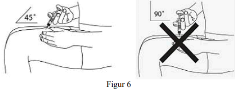 Plasser sprøyten i omtrent 45 graders vinkel til hudfolden. Med en rask enkelbevegelse stikkes nålen inn gjennom huden så langt som det går (se figur 6).