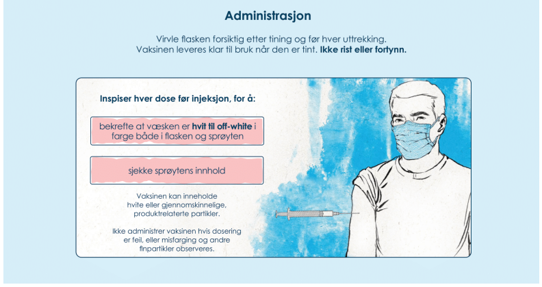 Vaksinene bør inspiseres visuelt for synlige partikler og misfarging før administrering.