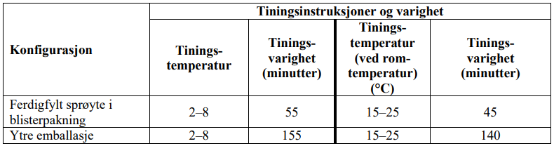 Tin hver ferdigfylte sprøyte før bruk ved å følge instruksjonene nedenfor. Sprøytene må tines i blisterpakningene (hvert blister inneholder 2 ferdigfylte sprøyter) eller i egen ytre emballasje, enten i kjøleskap eller i romtemperatur (tabell 4).
