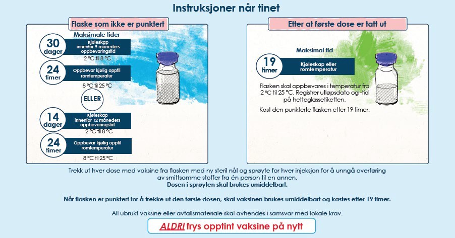 Vaksinen skal ikke fryses på nytt etter tining.