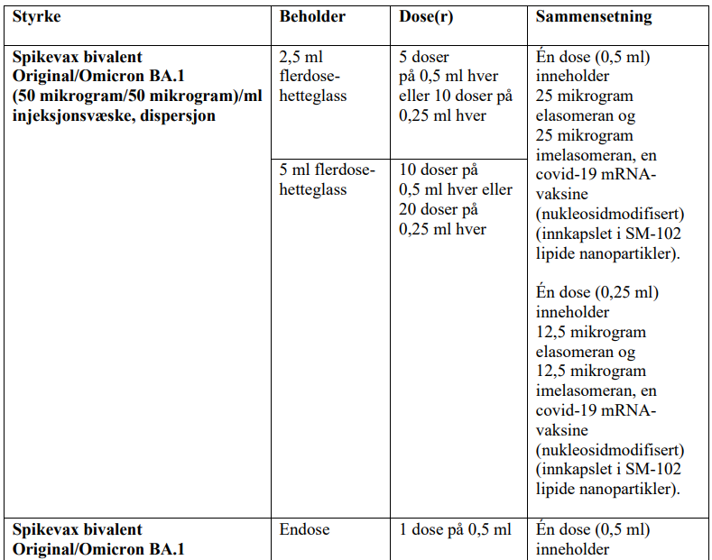 Spikevax bivalent Original/Omicron BA.1 er en hvit til off-white dispersjon som leveres i et 0,5 ml endosehetteglass (glass) med gummipropp og et blått vippelokk av plast med aluminiumsforsegling.