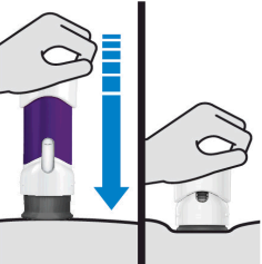 Ved injeksjon, press håndtaket helt ned til den lilla hoveddelen ikke er synlig, for å injisere hele dosen. IKKE LØFT OPP DEN FERDIGFYLTE PENNEN under injeksjon! Hvis du gjør det, låses den ferdigfylte pennen og du får ikke tatt hele dosen.