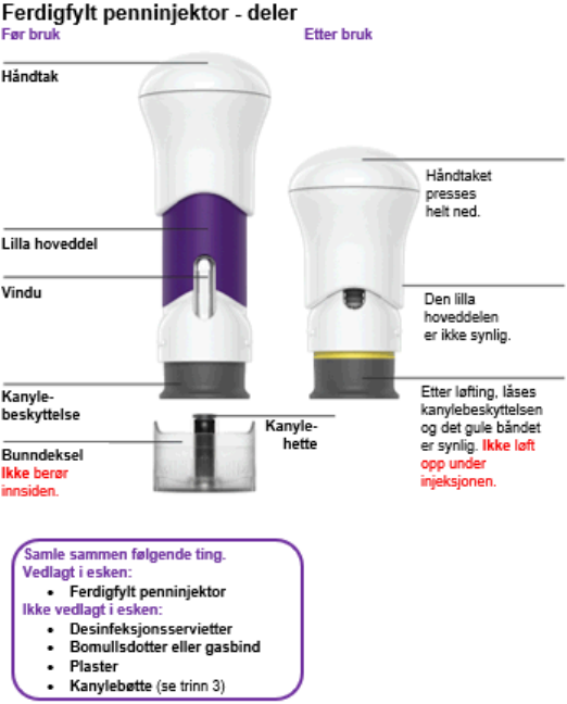 For å redusere risikoen for utilsiktede nålestikk, har hver ferdigfylte penn en kanylebeskyttelse som automatisk dekker nålen og låses etter at du har satt injeksjonen og injektoren løftes opp. Ikke løft opp den ferdigfylte pennen under injeksjonen før injeksjonen er fullført.