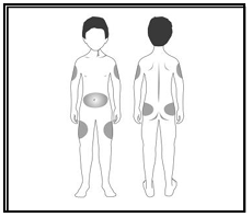1. Velg et injeksjonssted (lår, mage, armer (deltamuskel), sete). De best egnede områdene for injeksjon er markert i grått på bildet. Legen gir deg råd om mulige injeksjonssteder.