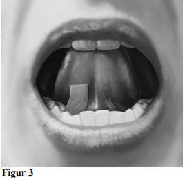 Drikk vann for å fukte munnen. Hold filmen mellom to fingre i ytterkantene og legg en film på innsiden av høyre eller venstre kinn (se figur 4).