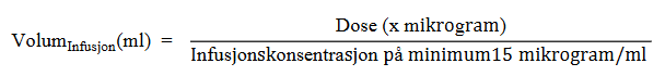Beregn maksimalt volum som kan administreres for beregnet dose (basert på behandlingsdag, dose og pasientens BSA) ved bruk av en infusjonskonsentrasjon på minimum 15 mikrogram/ml.