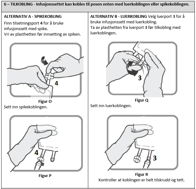 Infusjonsvæsken må administreres til pasienter ved bruk av et infusjonssett utstyrt med et 0,2 mikrometer filter. Filtreringen endrer ikke oppløsningens styrke.