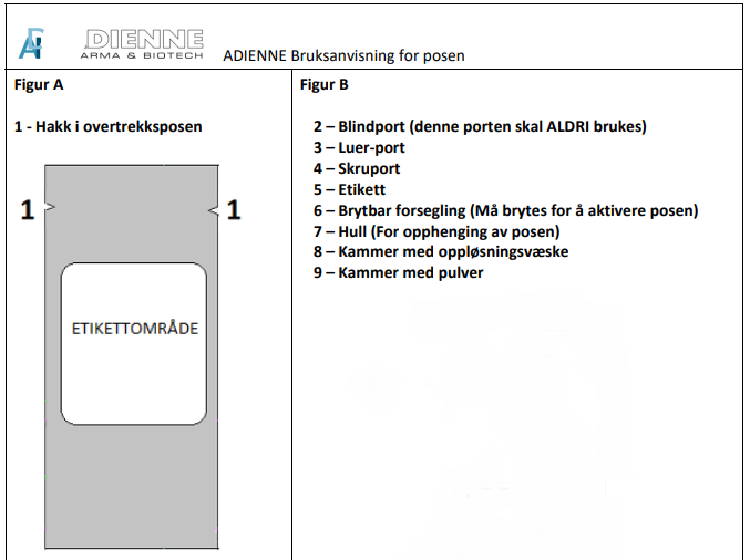 Den endelige rekonstituerte oppløsningen oppnås etter anbrudd av den brytbare forseglingen på posen med to kammer, og blanding av innholdet (pulver og oppløsningsvæske) inntil pulveret er løst fullstendig opp.