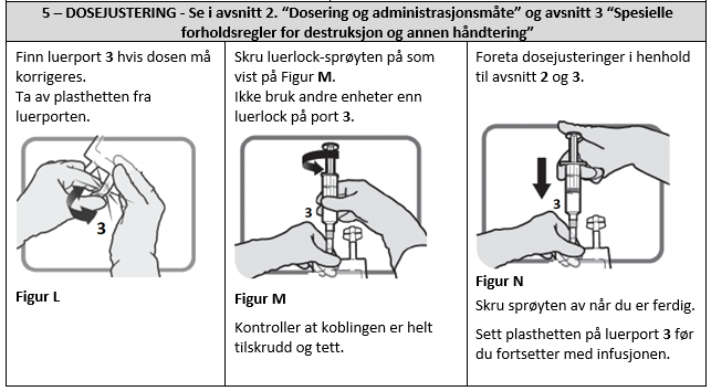 Før og etter hver infusjon må den intravenøse kateterslangen skylles med omtrent 5 ml natriumklorid 9 mg/ml (0,9%) injeksjonsoppløsning.
