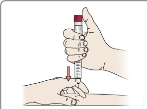 Hold en rengjort hudfold og sett kanylen rett ned i huden. Trykk på doseringsknappen og hold den inne i minst seks sekunder for å sikre at du får hele dosen.
