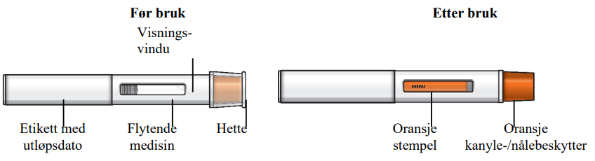 Oppbevar den ferdigfylte pennen i den ytre pakningen for å beskytte den mot lys.