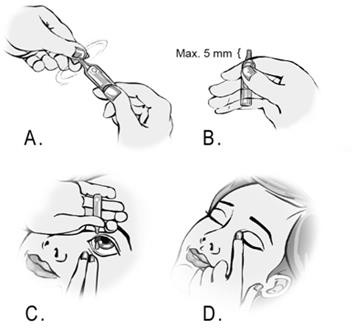 Bøy hodet bakover eller legg deg ned. Legg hånden på pannen. Pekefingeren skal være på linje med øyebrynet eller hvile på neseroten. Se opp. Trekk nedre øyelokk nedover med den andre hånden. Ikke la noen del av beholderen berøre øyet eller området rundt øyet. Klem forsiktig på beholderen slik at en dråpe faller ned i rommet mellom øyelokket og øyet. (Bilde C). Ikke blunk i det du drypper dråpen i øyet. En endosebeholder inneholder nok oppløsning til begge øynene.