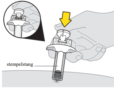 Sørg for å skyve stempelstangen helt ned for å få med alt legemiddel og utløse kanyleskjoldet.