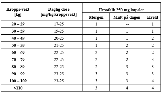 Primær biliær kolangitt: Den vanlige dosen er 12-16 mg per kg kroppsvekt daglig.