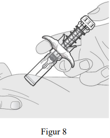 Fjern tommelen sakte fra stempelhodet. Stempelet vil bevege seg opp med fingeren og trekke nålen inn i kanylebeskyttelsen (se figur 8).