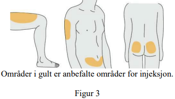 Hvis omsorgsgiveren setter injeksjonen, kan overarmene eller baken også brukes (se figur 3).