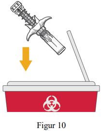 Kast brukte sprøyter umiddelbart etter bruk i en punkturresistent beholder, f.eks. en kanylebøtte i henhold til lokale retningslinjer. Ikke kast løse sprøyter i husholdningsavfallet (se figur 10).