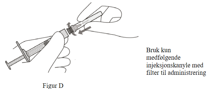 4. Fest injeksjonskanylen med filter aseptisk og godt til sprøytens luer-lock (se Figur D).