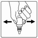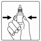 Trinn 4) Bøy hodet bakover. Bruk fingeren din til å trekke ned det nedre øyelokket. Klem forsiktig på flasken mens den fortsatt er opp-ned for å dryppe én dråpe (0,01 ml) i det første øyet. |