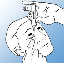 Trekk det nederste øyelokket nedover med en finger. Hold tuben loddrett i den andre hånden med spissen nedover - derved dannes en liten dråpe på spissen av tuben og dråpen dryppes i øyet (mellom nedre øyelokk og øyet). Pass på så ikke spissen på tuben berører noe.
